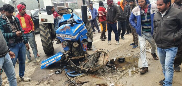 डंफर की टक्कर से ट्रैक्टर हुआ चकनाचूर