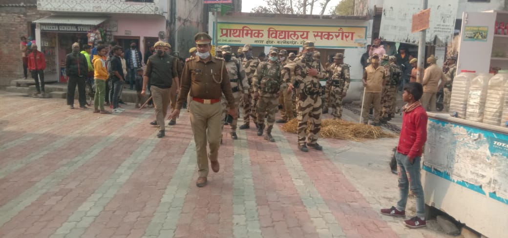 पुलिस, पीएसी एवं अर्धसैनिक बल के जवानों के साथ अधिकारियों ने मतदान केंद्रों का निरीक्षण किया