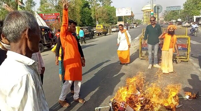 करनैलगंज(गोंडा)। राजस्थान में तीन सौ वर्ष पुराने मंदिर सहित तीन मंदिरों को तोड़े जाने के विरोध में धर्म रक्षा सेतु के कार्यकर्ताओं ने शनिवार की शाम को राजस्थान सरकार का पुतला दहन करके अपना विरोध व्यक्त किया। गत दिनों राजस्थान के अलवर जिले में तीन मंदिरों को तोड़कर ध्वस्त कर दिया गया था जिसमें एक मंदिर को तीन सौ वर्ष पुराना बताया जा रहा है। मंदिर तोड़े जाने का विरोध करते हुए शनिवार को धर्म रक्षा सेतु के कार्यकर्ताओं ने धर्म रक्षा सेतु के संस्थापक आयुष सोनी के नेतृत्व में बस स्टेशन चौराहे पर राजस्थान सरकार का पुतला दहन करते हुए राजस्थान सरकार विरोधी नारे लगाये। इस मौके पर आयुष सोनी सहित भोले बाबा, कन्हैयालाल वर्मा, अरमान पुरवार, सचिन गुप्ता, पीयूष शुक्ला, आदर्श मिश्रा, मयंक मिश्रा, आदर्श गुप्ता, अभिनव सिंह खालसा, अभिजीत सोनी, रेशू कौशल आदि सहित काफी संख्या में लोग मौजूद रहे।