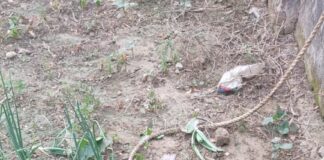 प्राथमिक विद्यालय के निकट स्थित तालाब में पकड़ा गया विशालकाय मगरमच्छ।