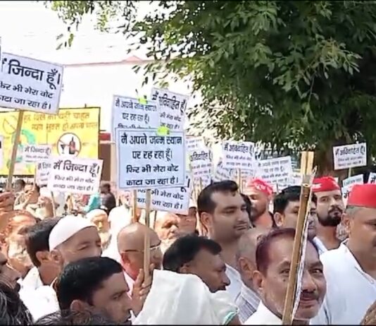 साहब मैं जिंदा हूं अविवाहित हूं डीएम कार्यालय में पोस्टर लेकर पहुंचे सैकड़ो लोग जाने क्या है पूरा मामला